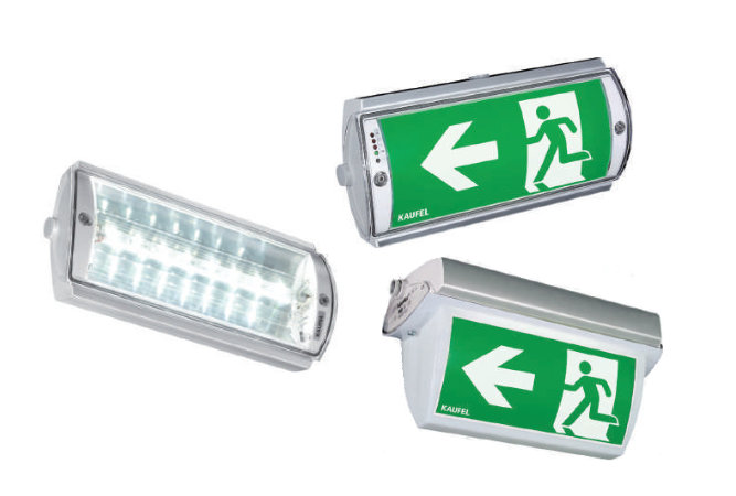 - modular aufgebaute Sicherheits- und LED-Rettungszeichenleuchte aus eloxiertem Aluminium und hochwertigem Kunststoff mit rastbarer Haube für schnellen und sicheren Leuchtmittelwechsel