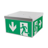 Rettungszeichenleuchte ZIBAL 40 E Robuste Rettungszeichenleuchte mit vierseitigem Lichtaustritt. Ausführung gem. DIN EN 60598 T 2-22, DIN EN 1838. Piktogramm gem. DIN 4844. Gehäuse: Stahlblech, weiss, RAL 9016, Abmessungen: L404 x B404 x H226mm, Schutzart: IP44, Schutzklasse: I, Anschlussspannung: 230 V AC, Anschlussleistung: 15,2 VA, Erkennungsweite: 40m, Montageart: Deckenaufbau inkl. Kettenbefestigungsset, Dimmung: DALI (DIMD), Überbrückungszeit: 3h, Akku: NiCd/NiMh, Ausführung mit: SelfControl (SC), Typ: ZIBAL 40 E, Fabrikat: Elektroplanet AG