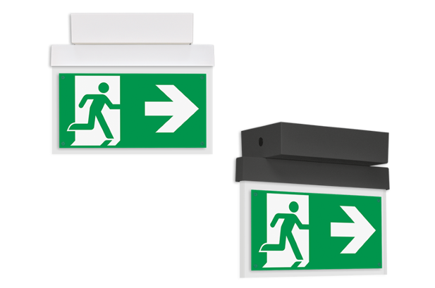 Durch einfaches ummontieren des Containers ist die Leuchte universell zur Decken- und Wandaufbaumontage geeignet. Auch eine 90 Grad verdrehte Wandparallelmontage ist möglich, ein entsprechendes Piktogramm-Set ist optional erhältlich.