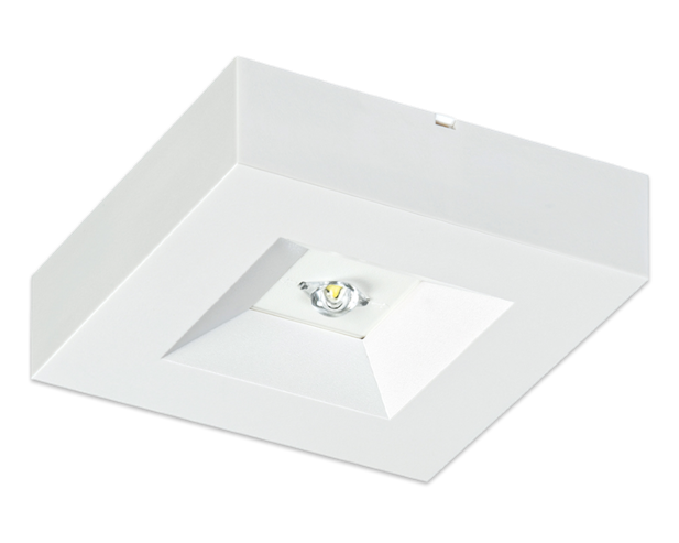 Ausführung für Deckenaufbaumontage mit Hochleistungs-LED und gegossener Acryloptik. Die Optik für Flächenausleuchtung ist vormontiert, die Optik für Fluchtwegausleuchtung liegt bei.