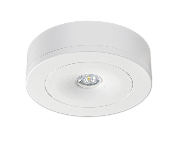 Ausführung für Deckenaufbaumontage mit einer Hochleistungs-LED (Schaltungsart: Bereitschaftsschaltung) und gegossener Acryloptik zur Flächenausleuchtung durch kreisförmige Lichtlenkcharakteristik oder Fluchtwegausleuchtung durch rechteckige Lichtlenkcharakteristik.