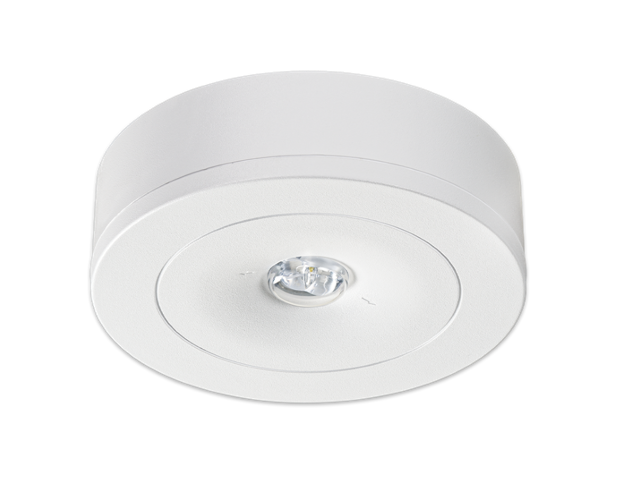 Ausführung für Deckenaufbaumontage mit einer Hochleistungs-LED (Schaltungsart: Bereitschaftsschaltung) und gegossener Acryloptik zur Flächenausleuchtung durch kreisförmige Lichtlenkcharakteristik oder Fluchtwegausleuchtung durch rechteckige Lichtlenkcharakteristik.