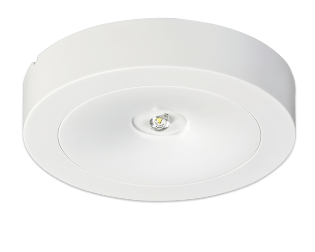 Ausführung für Deckenaufbaumontage mit Hochleistungs-LED (Schaltungsart: Bereitschaftsschaltung) und gegossener Acryloptik zur Flächenausleuchtung durch kreisförmige Lichtlenkcharakteristik.