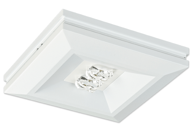 Ausführung für Deckenaufbaumontage mit zwei Hochleistungs-LEDs und gegossener Acryloptik zur Fluchtwegausleuchtung durch rechteckige Lichtlenkcharakteristik.