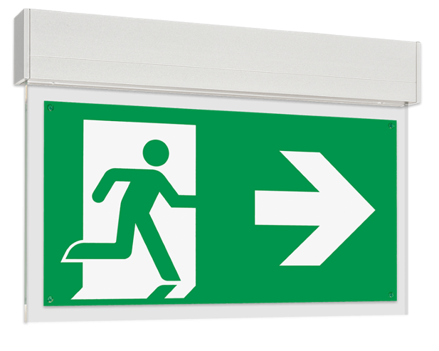 Extrem schlankes Gehäuse aus eloxiertem Aluminium-Strangguss mit schraubenlosen Verschlusskappen. Universalmontage für Decken- und Wandaufbau durch Wenden des oberen Leuchtenprofiles. Im Leuchtenpreis ist pro Leuchte ein Piktogramm-Vorsatzfolien-Set - Pfeil links/rechts/unten/oben/blind (Erkennungsweite 30 m) enthalten.