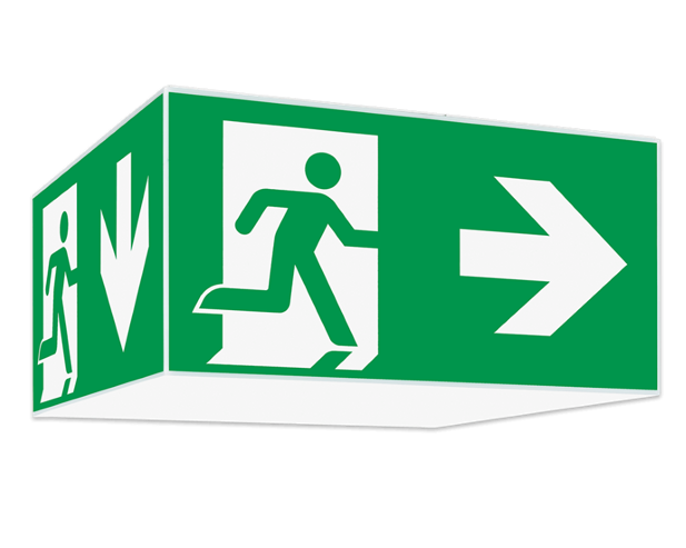 Modernes, kubisches Leuchtengehäuse aus Kunststoff und dreiseitig bedruckten Piktogrammscheiben sowie einer grünen Scheibe.