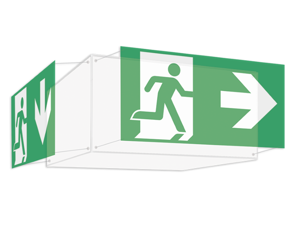 - Leuchtenhaube mit vier opalen Scheiben (Piktogramm-Vorsatzfolien können individuell zusammengestellt werden und müssen separat bestellt werden)