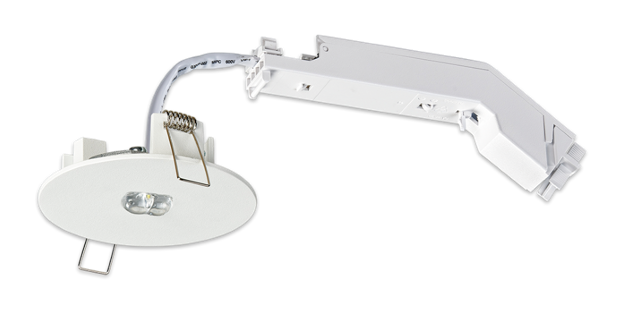 Annähernd deckenbündiger Leuchtenkörper aus Aluminium-Druckguss, pulverbeschichtet in weiss in runder Ausführung für Deckeneinbau mit gegossene Acryloptik zur Fluchtwegausleuchtung.