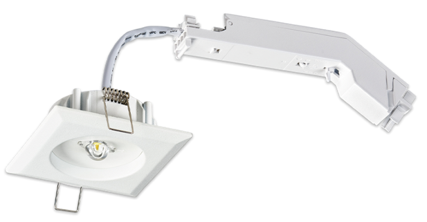 Annähernd deckenbündiges Einbaugehäuse aus Polycarbonat mit quadratischer Abdeckung aus Aluminium-Druckguss, pulverbeschichtet in weiss.