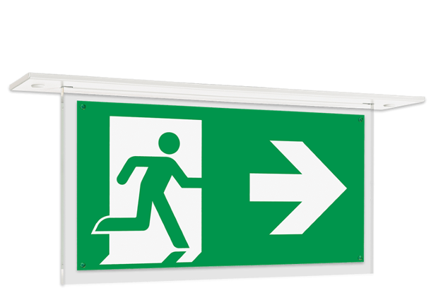 Lieferbar als Deckeneinbaumontage mit 10 mm dicker Lichtlenkscheibe und austauschbaren Piktogrammen.