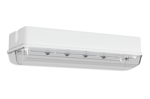 Sicherheitsleuchte mit Schutzart IP65 aus Polycarbonat mit klarer Leuchtenhaube und Rast-Optiken zur Fluchtwegausleuchtung für Deckenmontage.