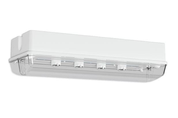 Sicherheitsleuchte mit Schutzart IP65 aus Polycarbonat mit klarer Leuchtenhaube, ausgestattet mit Tiefstrahl-Optiken für hohe Deckenhöhen.