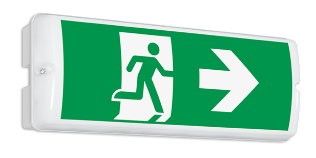 - Polycarbonat-Gehäuse mit flacher, opaler Leuchtenhaube für einseitige Piktogrammbestückung
