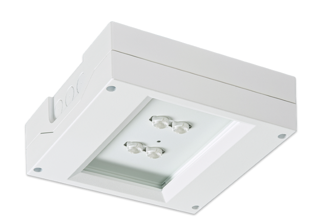 Witterungsfestes Aluminium-Druckgussgehäuse mit Sicherheitsglasscheibe. Ausführung für Deckenmontage mit vier Hochleistungs-LEDs und gegossenen Acryloptiken als Hallentiefstrahler mit Tiefstrahloptiken. Kabeleinführung in Leuchtengehäuse von hinten und unten möglich. Die Leuchte ist serienmässig mit IP65-Membran-Druckausgleichsventil ausgestattet.