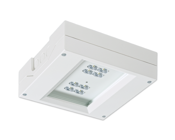Witterungsfestes Aluminium-Druckgussgehäuse mit Sicherheitsglasscheibe. Ausführung für Deckenmontage mit acht Hochleistungs-LEDs und gegossenen Acryloptiken, wahlweise erhältlich zur Flächen-, Fluchtwegausleuchtung oder als Hallentiefstrahler mit Tiefstrahloptiken.