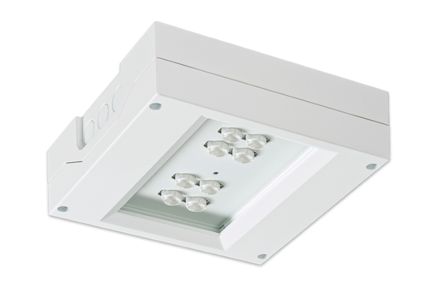 Witterungsfestes Aluminium-Druckgussgehäuse mit Sicherheitsglasscheibe. Ausführung für Deckenmontage mit acht Hochleistungs-LEDs und gegossenen Acryloptiken, wahlweise erhältlich zur Flächen-, Fluchtwegausleuchtung oder als Hallentiefstrahler mit Tiefstrahloptiken.