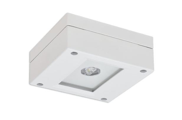 Witterungsfestes Aluminium-Druckgussgehäuse mit Sicherheitsglasscheibe. Ausführung für Deckenmontage mit Hochleistungs-LED und gegossener Acryloptik zur Fluchtwegausleuchtung.