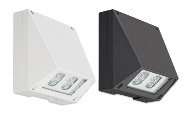 Witterungsfestes Aluminium-Druckgussgehäuse mit Sicherheitsglasscheibe. Ausführung für Wandmontage mit vier Hochleistungs-LEDs und gegossenen Acryloptiken zur Flächenausleuchtung.