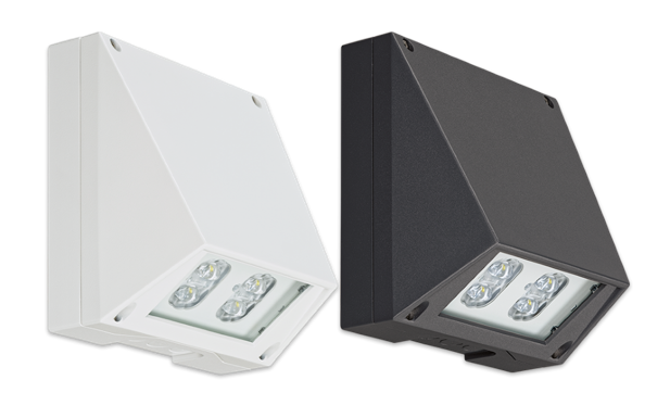 Witterungsfestes Aluminium-Druckgussgehäuse mit Sicherheitsglasscheibe. Ausführung für Wandmontage mit vier Hochleistungs-LEDs und gegossenen Acryloptiken zur Fluchtwegausleuchtung.