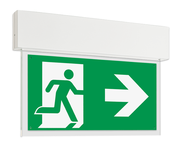 Ausführungen für Deckenmontage mit 10 mm dicker Lichtlenkscheibe und austauschbaren Piktogrammen. Im Leuchtenpreis ist pro Leuchte ein Piktogramm-Vorsatzfolien-Set - Pfeil links/rechts/unten/oben/blind (Erkennungsweite 30 m) enthalten.