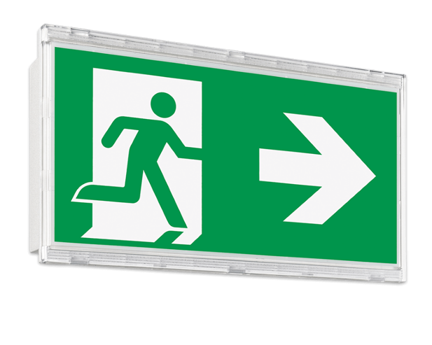 Formschöne, moderne Rettungszeichenleuchte aus Polycarbonat - inkl. Einsteck-Piktogrammset