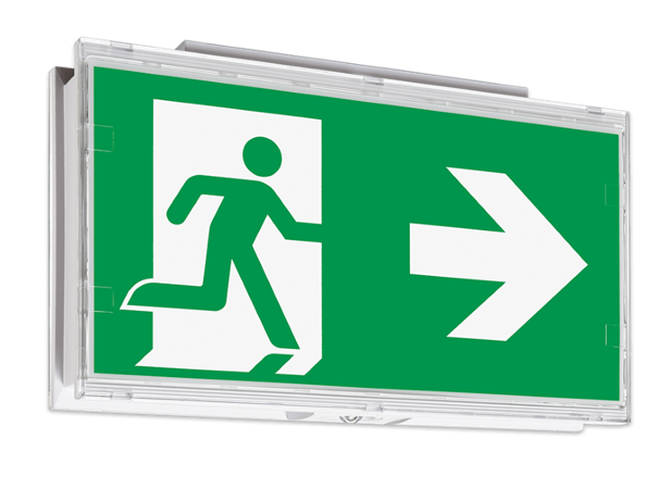 Kombinierte Rettungszeichen- und Sicherheitsleuchte aus weissem Polycarbonat mit klarer Haube und einfacher, schraubenloser Montage durch Klick-System.