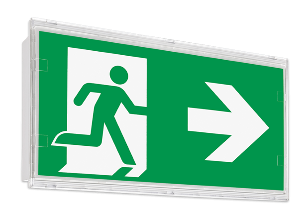 Formschöne, moderne Rettungszeichenleuchte aus Polycarbonat - inkl. Einsteck-Piktogrammset