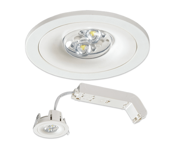 Annähernd deckenbündige Einbau-Sicherheitsleuchte mit rundem Kopf aus weissem Polycarbonat und Schutzart IP54 am Leuchtenkopf. Je nach Variante mit unterschiedlichen Versorgungscontainern lieferbar.