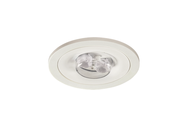 - Annähernd deckenbündige Einbauleuchte mit rundem Kopf aus weißem Polycarbonat