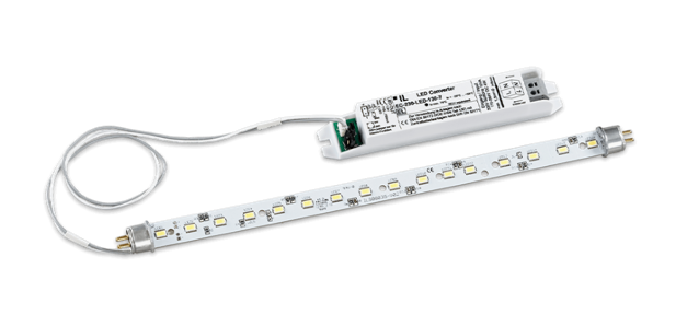 Umrüstset U-LED bestehend aus LED-Zeile mit 16 bzw. 8 Stück LEDs und LED-Converter zur Umrüstung von zentralversorgten Rettungszeichenleuchten mit 8W oder 6W T16 Leuchtstofflampen in LED-Technologie.
